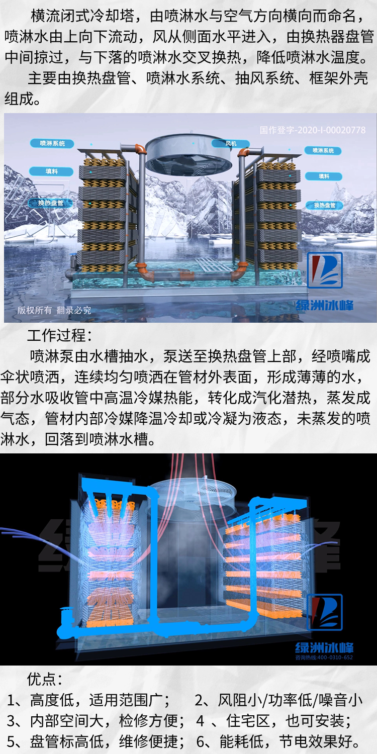 3、空气循环:干冷空气由横流闭塔两侧进入,高速水平掠过盘管,带走蒸发的水蒸汽,带走热能,湿度增加,由中间腔室的抽风机排出塔外。